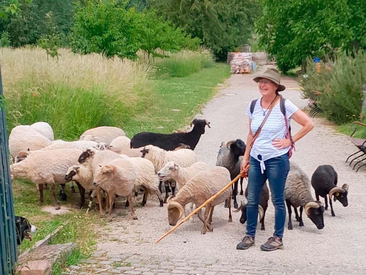 Hobbyschäferin Edith Hengge-Dörr widmet sich seit Jahren aktiv der Offenhaltung von Flächen zwischen den Weinbergen und schwer zugänglichen Gebieten der Urlaubsregion Deidesheim.
